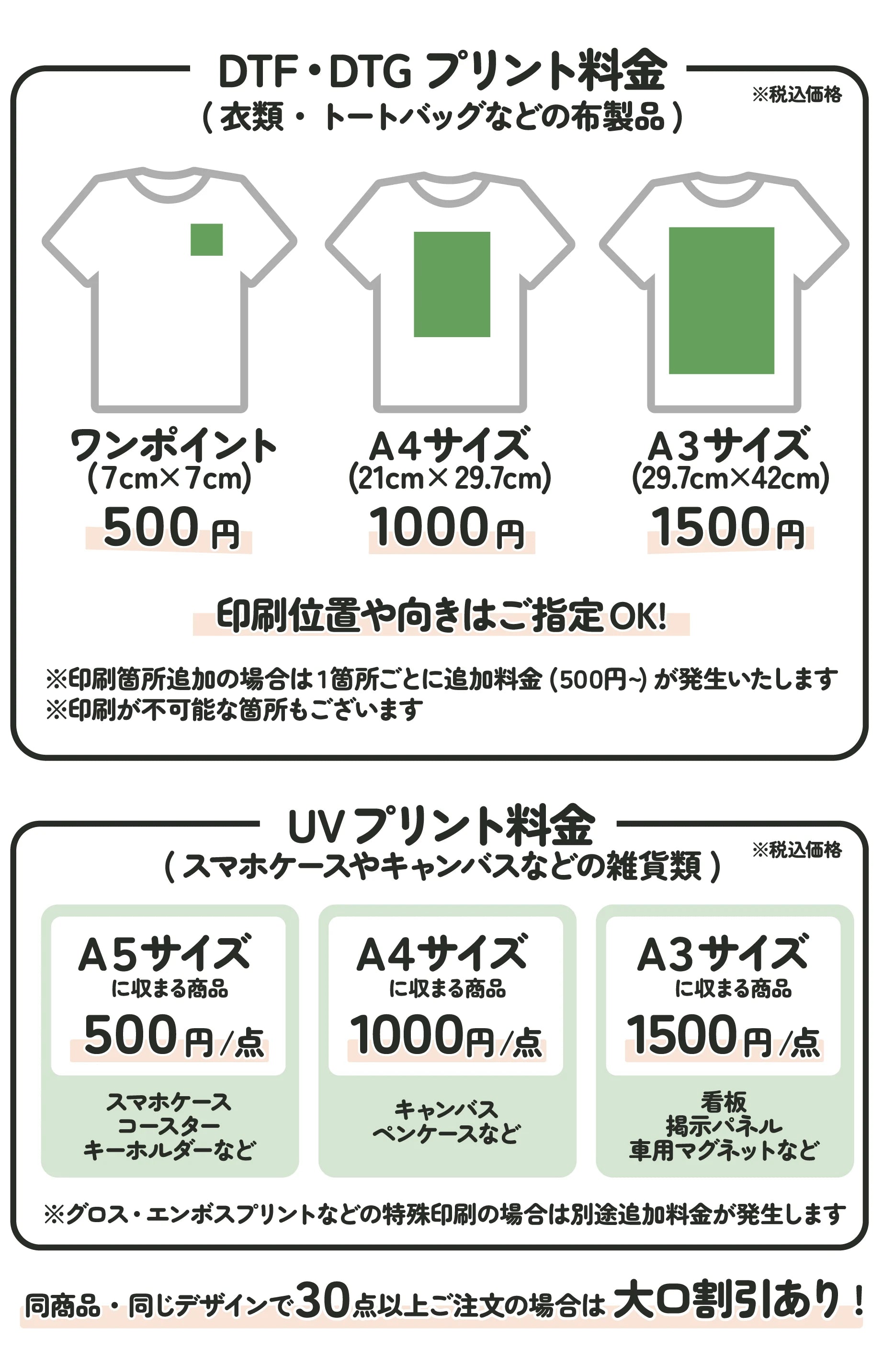 同一商品・同一デザインを30点以上ご注文の場合は大口割引を適用いたします。割引率は数量によって異なりますので、お問い合わせください。